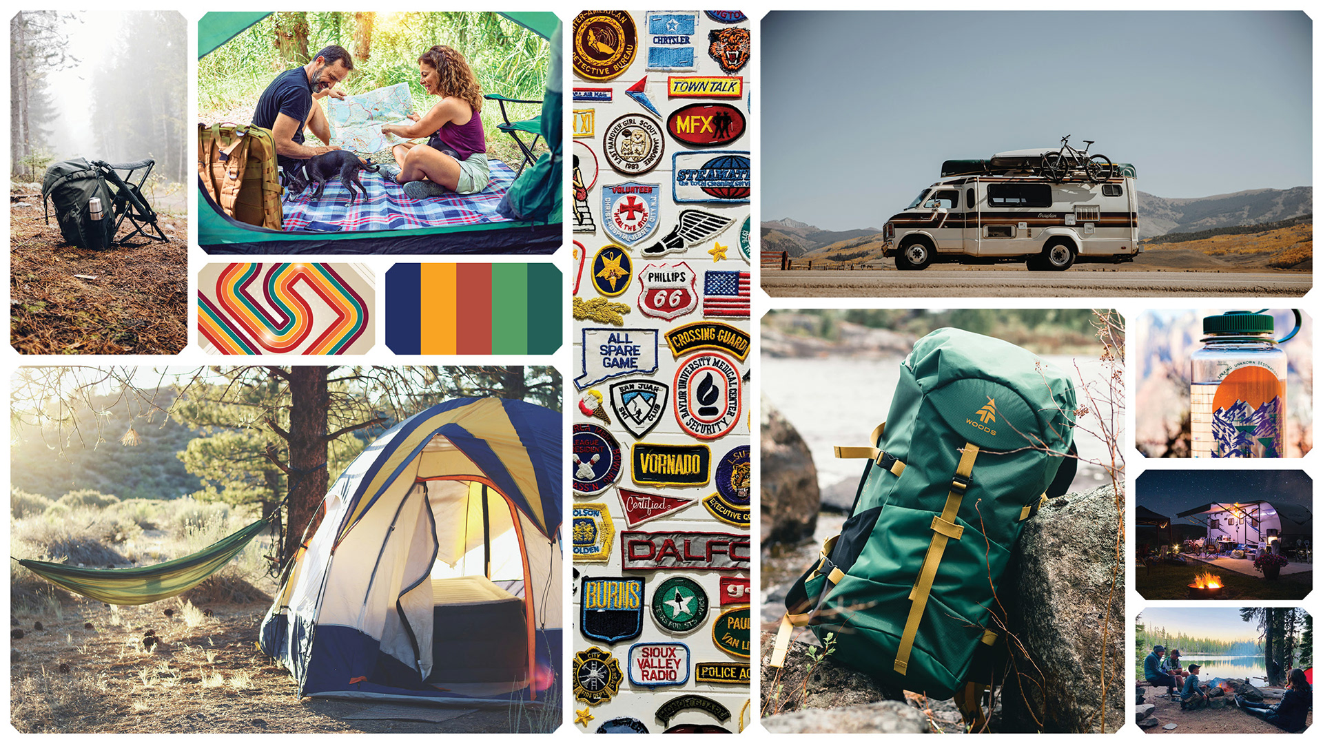 Retro color palette, rugged material, and stretched fabric over a rigid frame