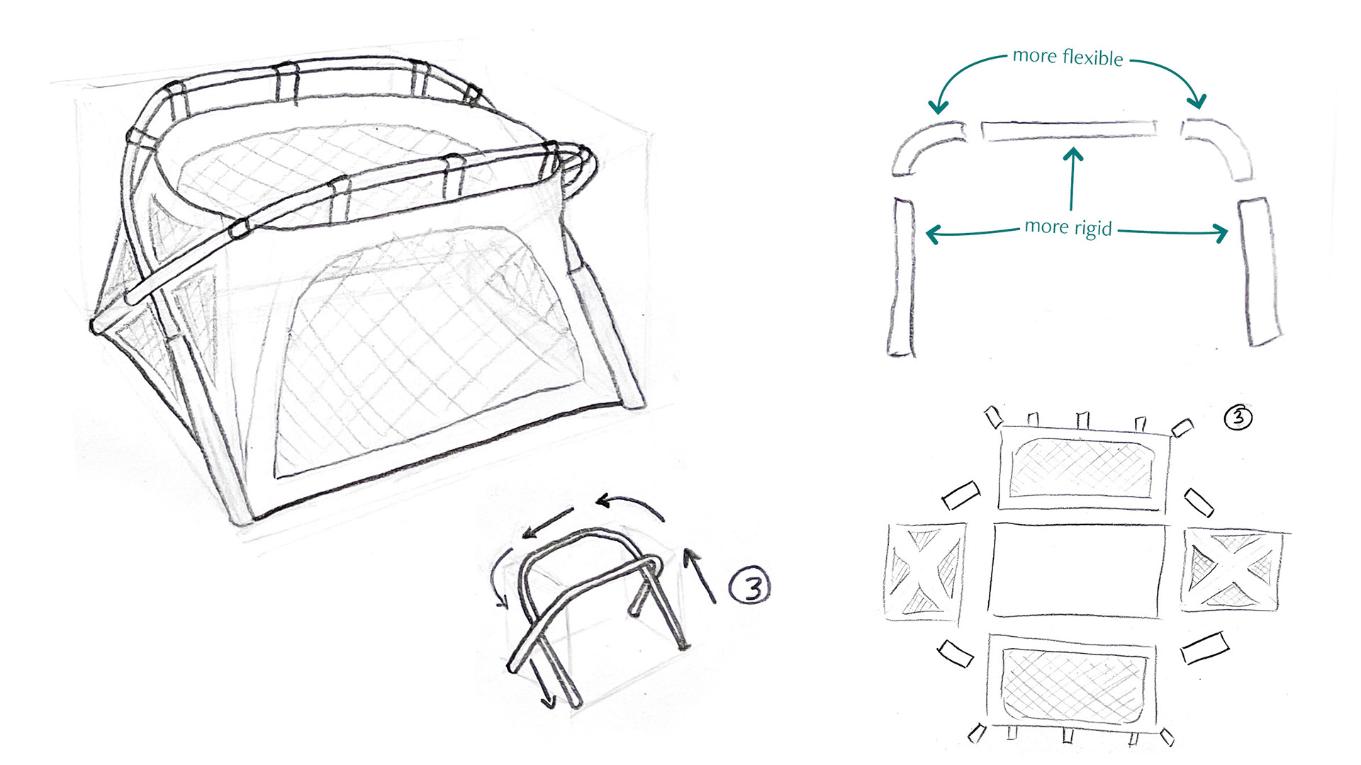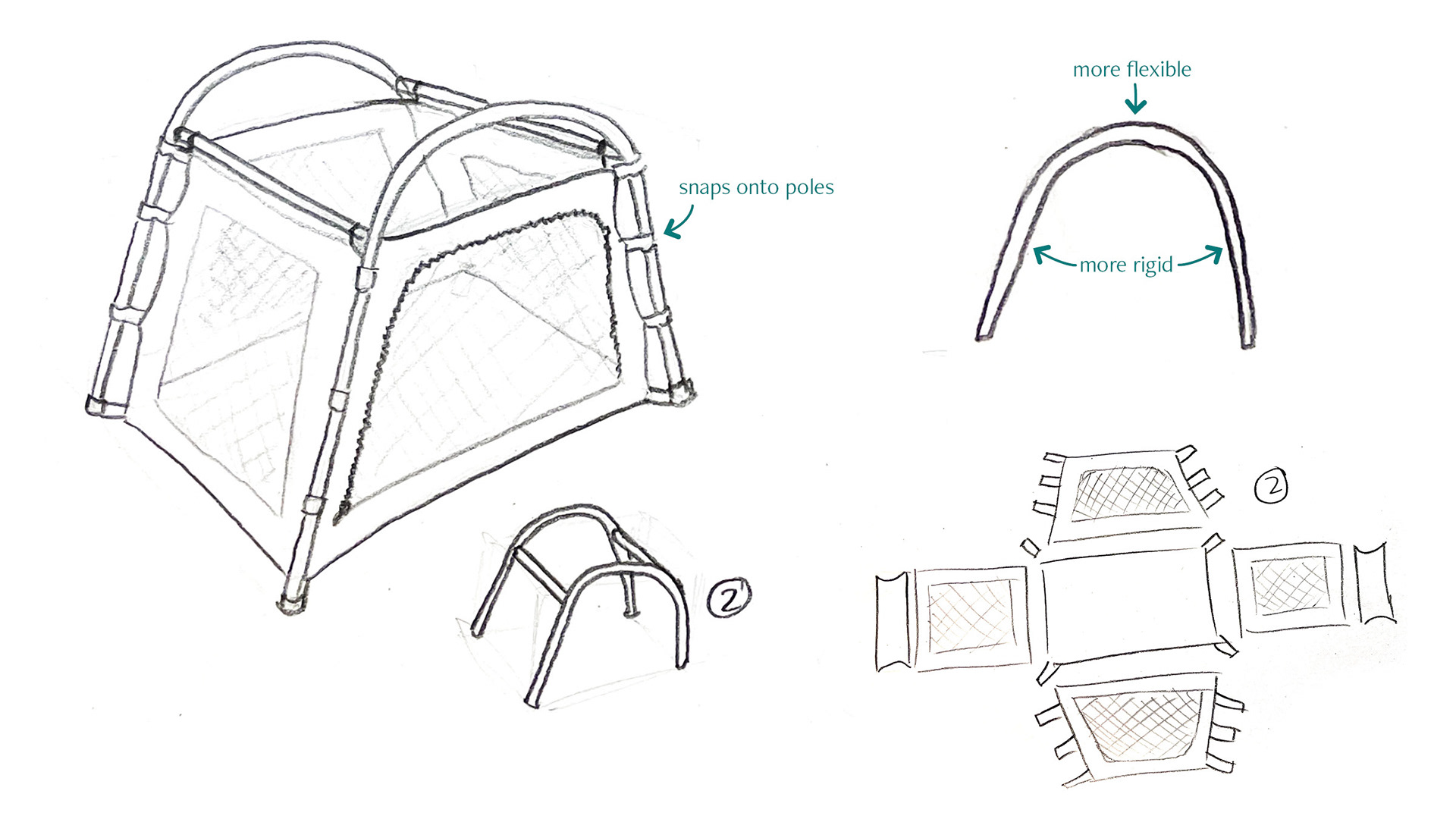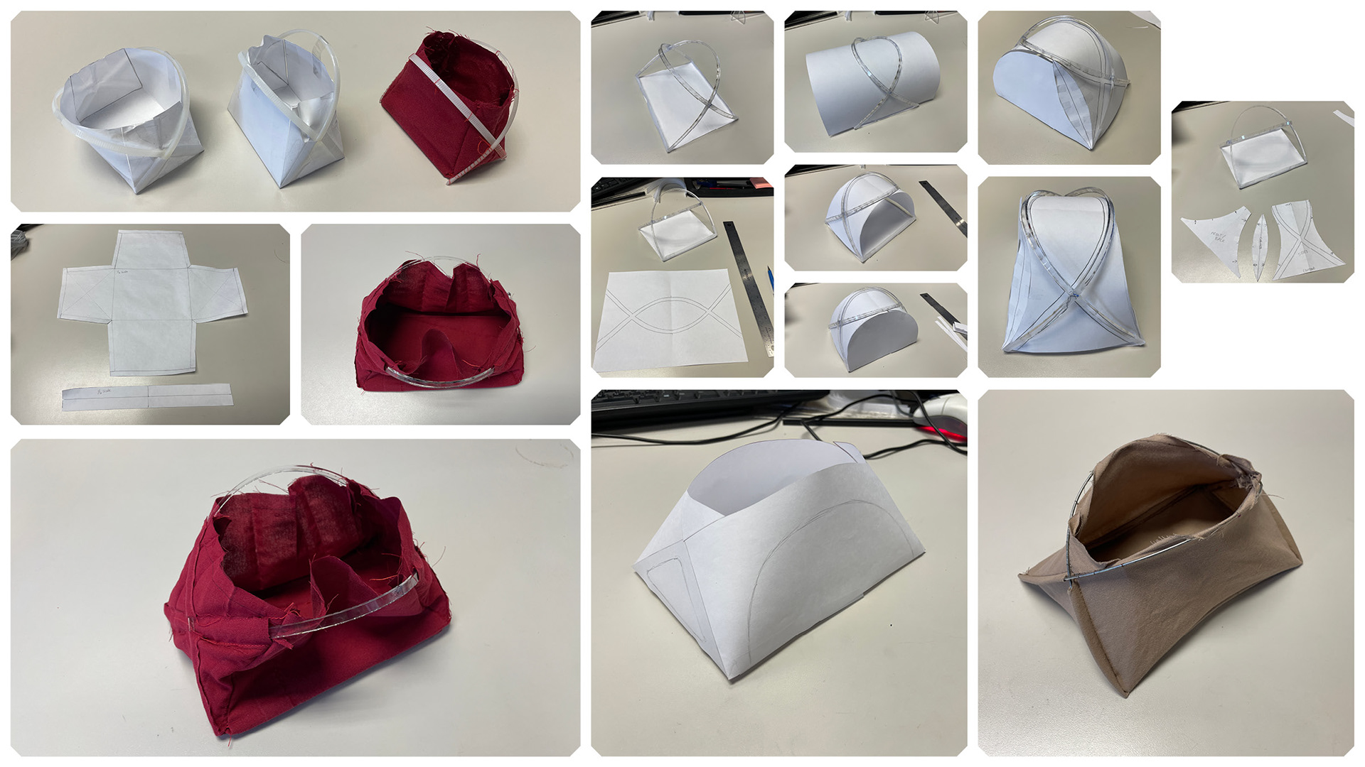 A mixture of fabric, paper, and flexible plastic to simulate final materials. Focused on forming the pattern for the design.